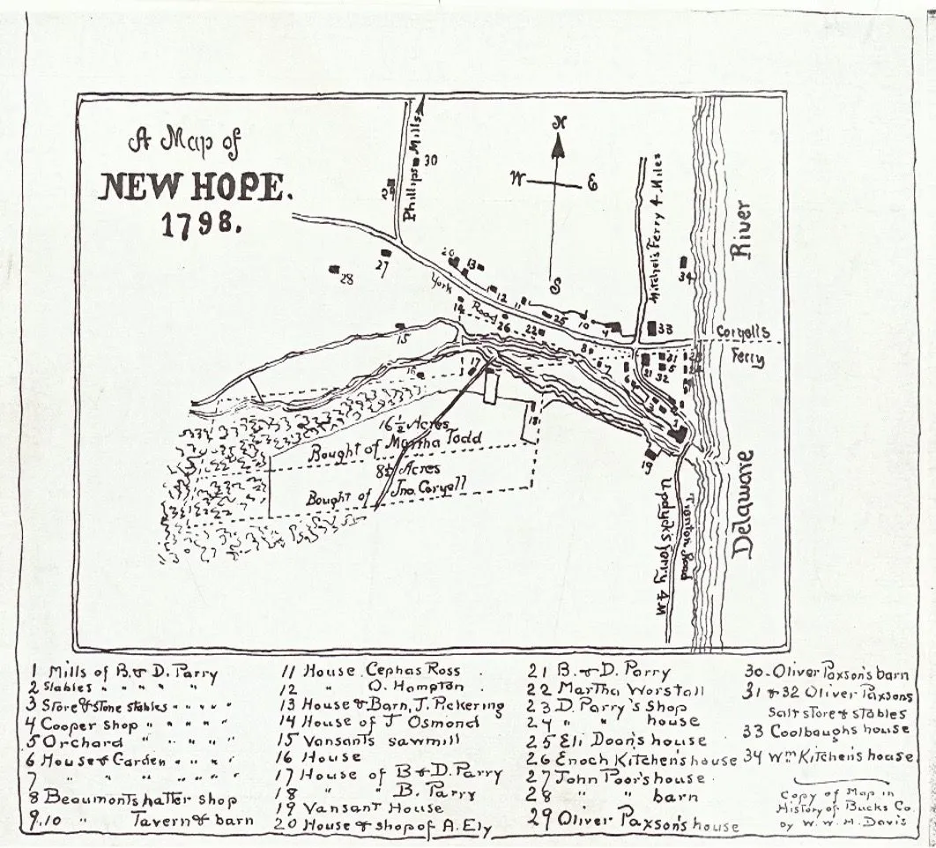 Along with the mill, Benjamin Parry purchased further Todd family holdings, including the larger tract that contains the John Quigley House site. A map created by Benjamin Parry of New Hope shows the original boundary of the property, labeled “16 ½ Acres Bought of Martha Todd”